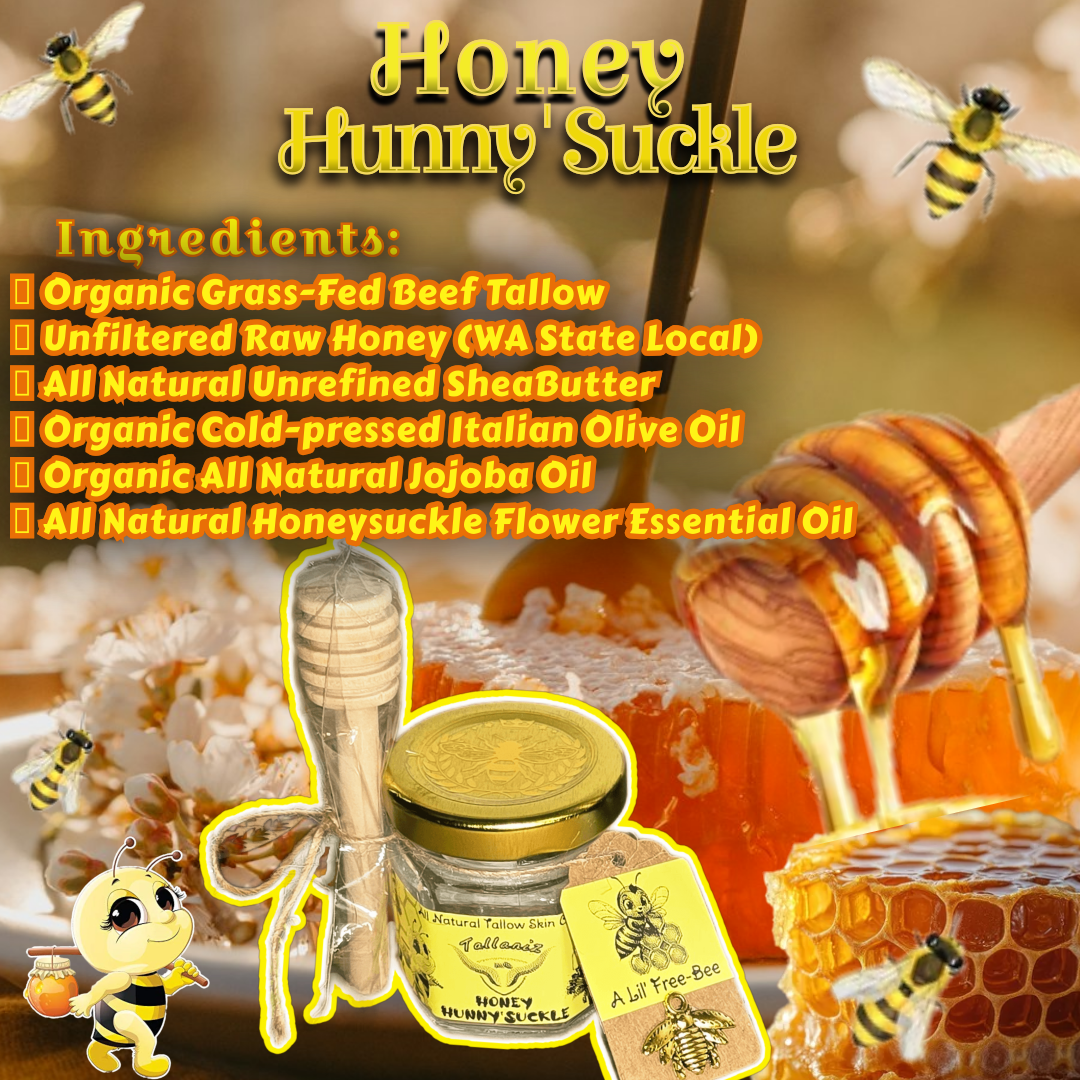 Our Honey Hunnyāsuckle Whipped Tallow cream is thoughtfully crafted with a touch of Washington State local raw honey, lending your skin a silky-smooth feel and a subtle, protective glow that only honey can provide.